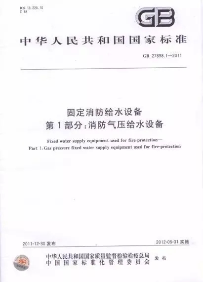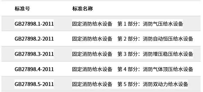 在2011年12月30日,國家又頒布了《GB27898:固定消防給水設備》;該標準作為GA30.2的升級標準,一共分為5個部分,(見下表):